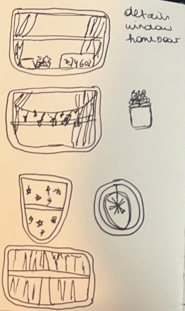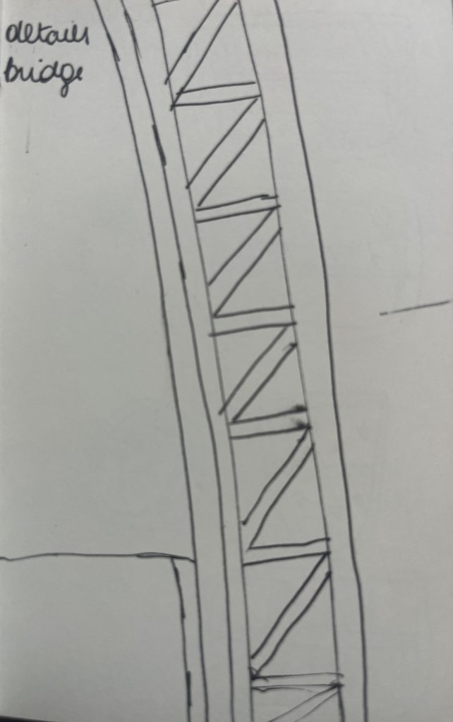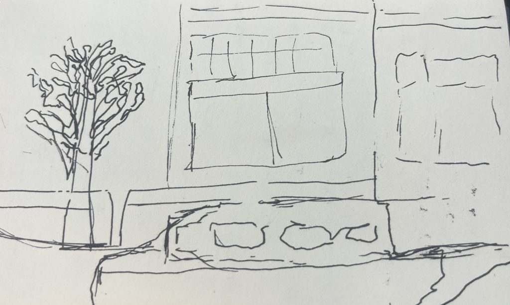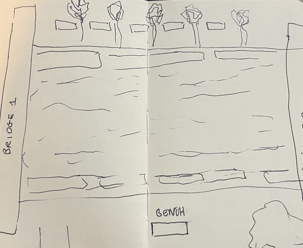 While observing, I took notes on thoughts that came to mind as I looked at the site. Sketches while looking in the details of my view from a bench on the site.