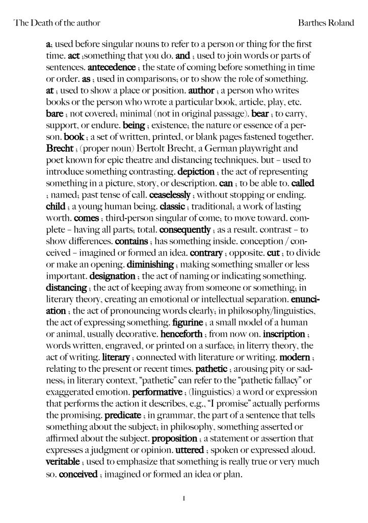 Barthes says that the author is no longer the one who gives a text its meaning. Instead, meaning is created while the text is being written and read. Writing isn’t about expressing the writer’s personal thoughts or feelings, it’s about using language to create meaning as it happens. This means that the reader and the language itself, not the author’s intentions, are what shape how we understand a text.