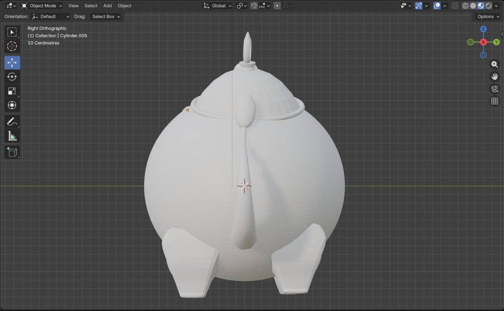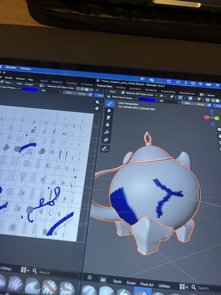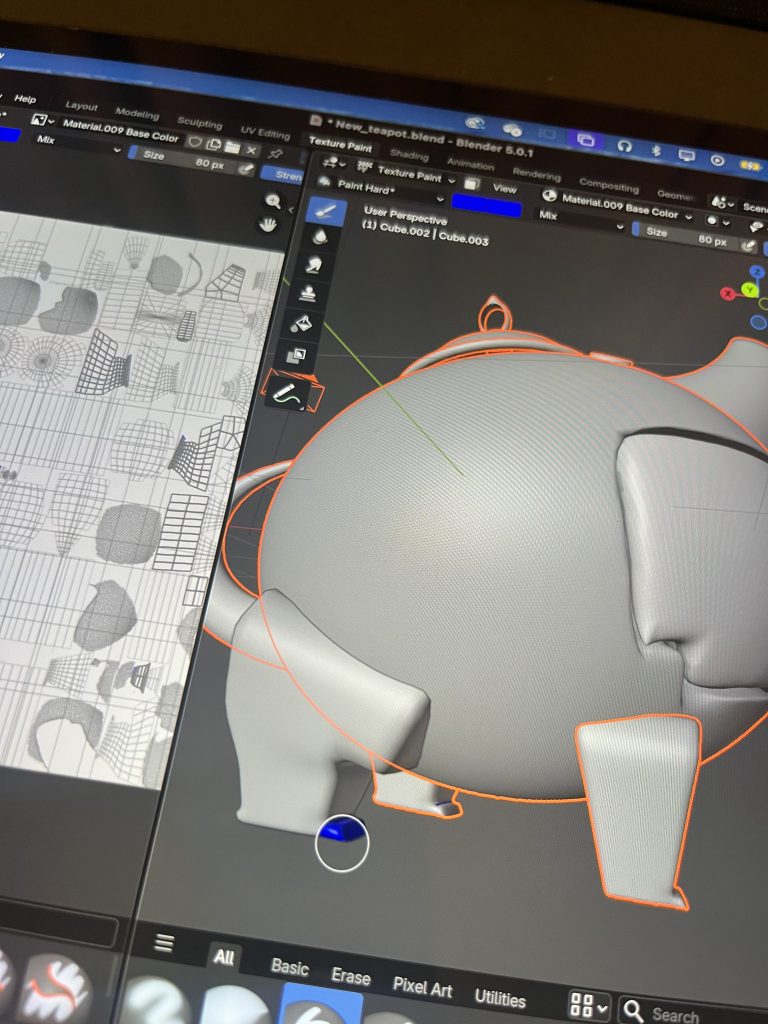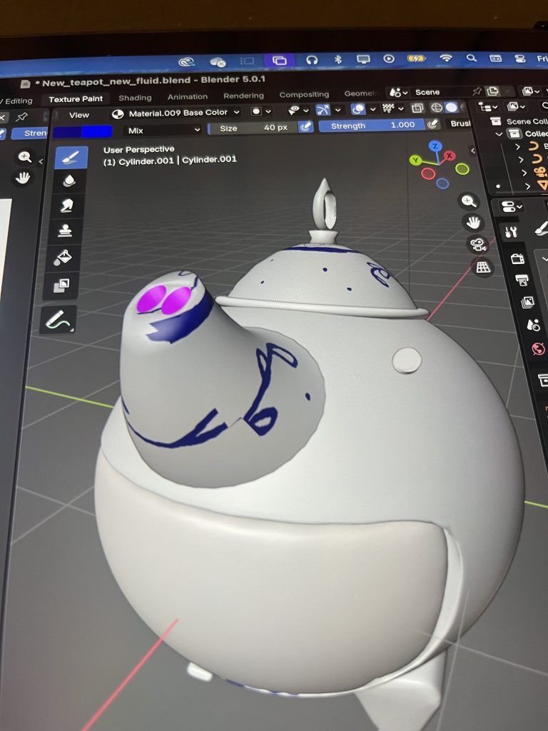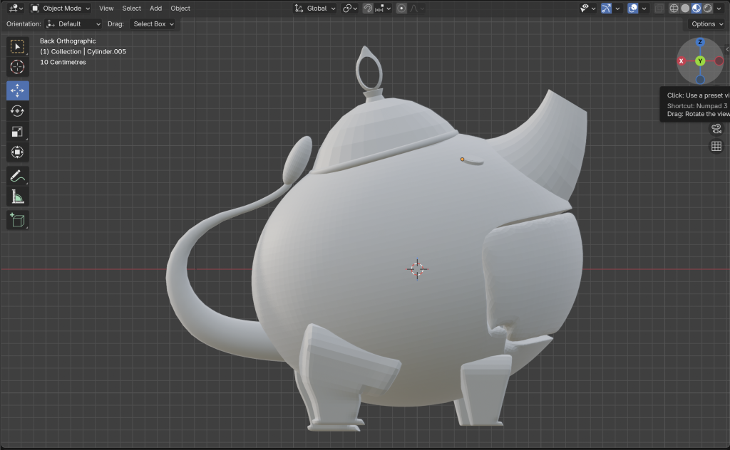 To start my enquiry, I chose to copy Fantasy Teapot (2023) by the artist Kikimori. This is a 3D model of a teapot inspired by Sandara Tang’s concept art, made entirely in Blender. I first attempted to make the teapot without watching any tutorials, to see how I could navigate the tool and gauge how accessible it really is without prior knowledge. Adding basic shapes and working with the first tools I found was straightforward. However, when it came to creating more complex shapes or achieving greater accuracy, it became more challenging, and I began watching tutorials to help me navigate the different panels and viewports of the software. It became clear that Blender is harder to use when the shapes you want to create cannot be derived from the basic toolbox. There is a pen tool available in edit mode, but making it work in 3D and aligning it accurately across different perspectives proved difficult. By repeating the process several times, I found I was able to create shapes based on the teapot with increasing accuracy. However, I kept encountering the same obstacles and was unable to find solutions to overcome them. The software offers many ways to achieve the same result, meaning the easiest approach often comes down to personal preference. Is Blender user-friendly, or do these multiple pathways make it more difficult? Arguably, it is a combination of both. Blender is an accessible programme for those wanting to learn 3D worldbuilding, but for complex work, it quickly demands a high level of knowledge and skill.