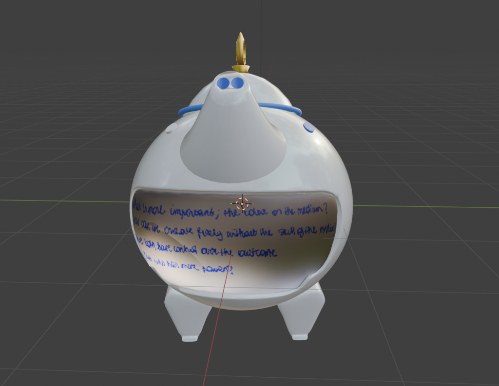 I chose to write the main idea of my research on my teapot in the software. This way, the handwriting on it reflects the dialogue and duality between the analogue and the digital. The analogue represents the idea, and the digital represents the medium. The text poses the central questions of my research: ‘What is more important: the idea or the medium? How can we create freely without the skill of the medium? We both have control over the outcome, but who has more power?’